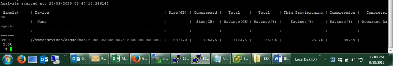 comprestimator -d “/vmfs/devices/disks/naa.60050763008085741800000000000002” -s SVC