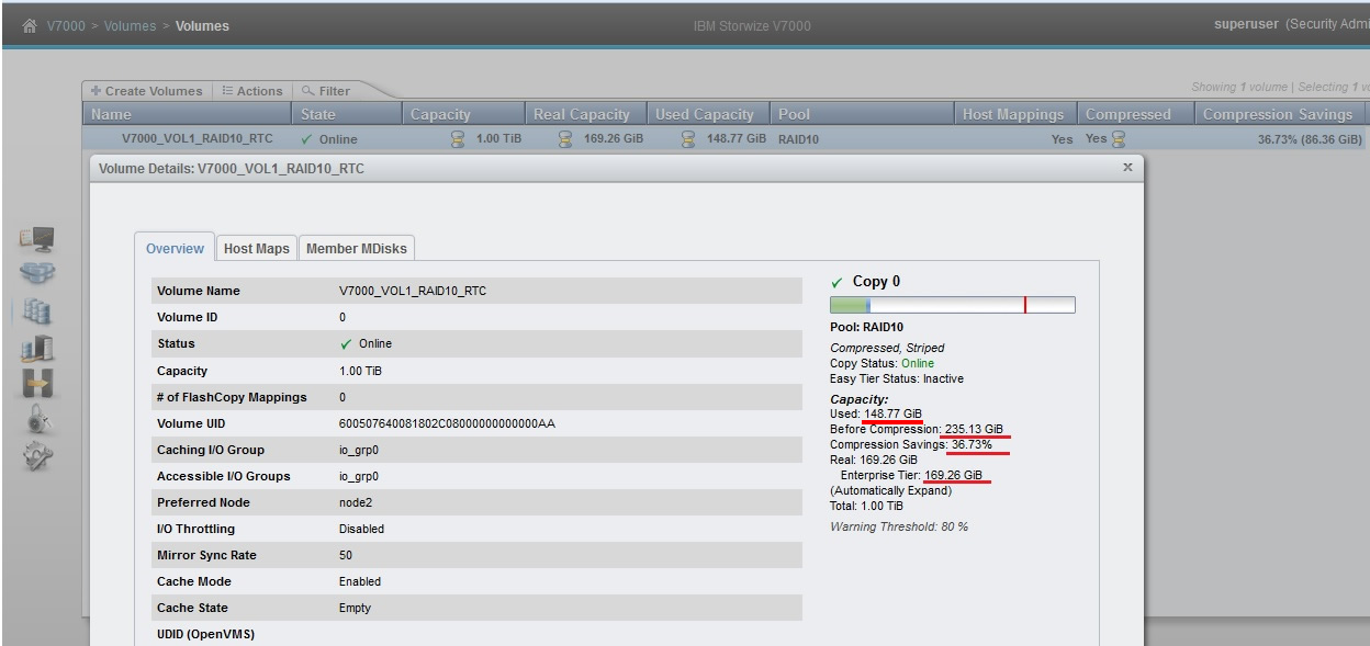 Sadece simulasyon değil ofisimizde bulunan v7000’in Real Time Compression’ını test ettiğimde de %36.73 kazanç sağladım. Resimde görebileceğiniz gibi sıkıştırılmadığında 235 GB yer kaplayan veri, sıkıştırıldığında 148 GB yer kaplıyor. Thin Provision ve AutoExpand’da dahil edildiğinde 169 GB volume’un toplam kapladığı alan.