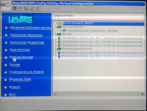 WebBIOS açıldıktan sonra 3 diskimizin yer aldığı RAID5 yapısı ve sunucuya yeni takmış olduğumuz gözükmektedir. Disklerin durumunun “Unconfigured Good”da olması gerekmektedir. Daha sonra Virtual Drives’a tıklayarak daha önce oluşturmuş olduğumuz RAID alanının durumunu göreceğiz. (Alttaki resim)