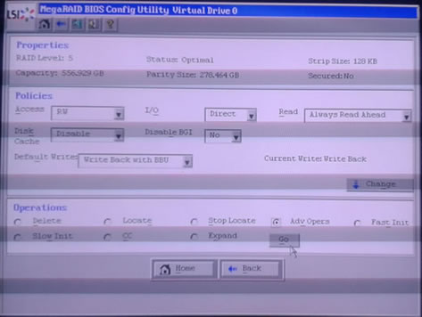 1Bu bölümde işlem yapacağımız RAID alanını işaretleyip, Properties’i seçtikten sonra Go butonuna basacağız. (Alttaki resim)2Daha sonra gelen sayfada eller hemen alışkanlık Expand butonuna gidecek fakat burada Adv_Opers şeklinde kısaltılan “Advanced Operations”ı seçip sonra GO butonuna basmalıyız.(Alttaki resim)