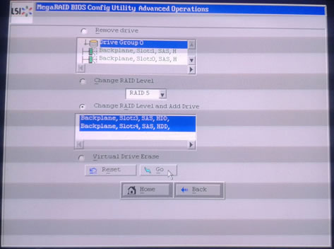 3Sonraki menüde yapmamız gereken ise “Change RAID Level and Add Drive”ı seçip Shift tuşu yardımıyla iki diski de seçili duruma getirmek ve GO butonuna basmak. (Alttaki resim)4Sonra açılan bilgi mesajı ise yeni eklediğimiz disklerde data protection açık olduğu ve kapatılacağını belirten onay kutucuğu. Yes butonuna bastıktan sonra ise Migration işleminin iptal edilemeyeceğini belirten bir onay kutucuğu daha belirecek. Buna da onay verdikten sonra RAID5 alanı reconstruction’a başlayacaktır. Buraya kadar geldikten sonra Home tuşuna basıp Exit ile WebBIOS’tan çıkıp Vmware ESX’inizi açabilir ve firmanızın çalışmasına devam edebilirsiniz. Bu işlem sırasında disklerin IOPS’u aşırı düşeceği için sunucu epey yavaş çalışacaktır. Bu yüzden sadece gerekli sanal sunucuları açmanız faydanıza. 5